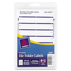 Amazon.com: avery labels 5200 Avery Print or Write File Folder Labels for Laser and Inkjet Printers, 1/3 Cut, Dark Blue, Pack of 252 (5200), 4 Packs $17.67$17.67 FREE Shipping More Buying Choices$17.66(2 new offers) Avery File Folder Labels for Laser and Inkjet Printers, 1/3 Cut, Red, Pack of 252 (5201), 5/8" x 3 1/2" 4.7 out of 5 stars215 $3.39$3.39$4.97$4.97